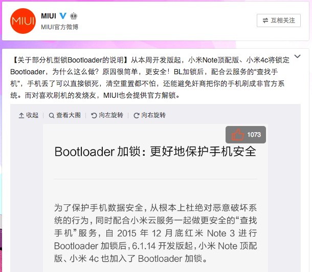 从本周开发版起,小米Note顶配版、小米4c将锁定Bootloader,为什么这么做?原因很简单,更安全!BL加锁后,配合云服务的“查找手机”,手机丢了可以直接锁死,清空重置都不怕,还能避免奸商把你的手机刷成非官方系统。而对喜欢刷机的发烧友,MIUI也会提供官方解锁。