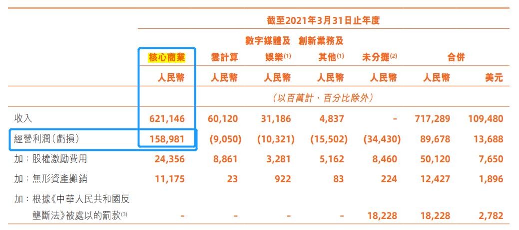 2.整个阿里巴巴集团拥有4大业务板块,分别是核心商业、云计算、数字媒体及娱乐、创新业务及其他。天猫淘宝属于核心商业板块,是阿里收入最高、赚钱最多的。上一财年的核心商业板块为阿里带来了1589亿元的经营利润。顺便提一句,阿里除了核心商业外其他三大板块业务均是亏钱的。