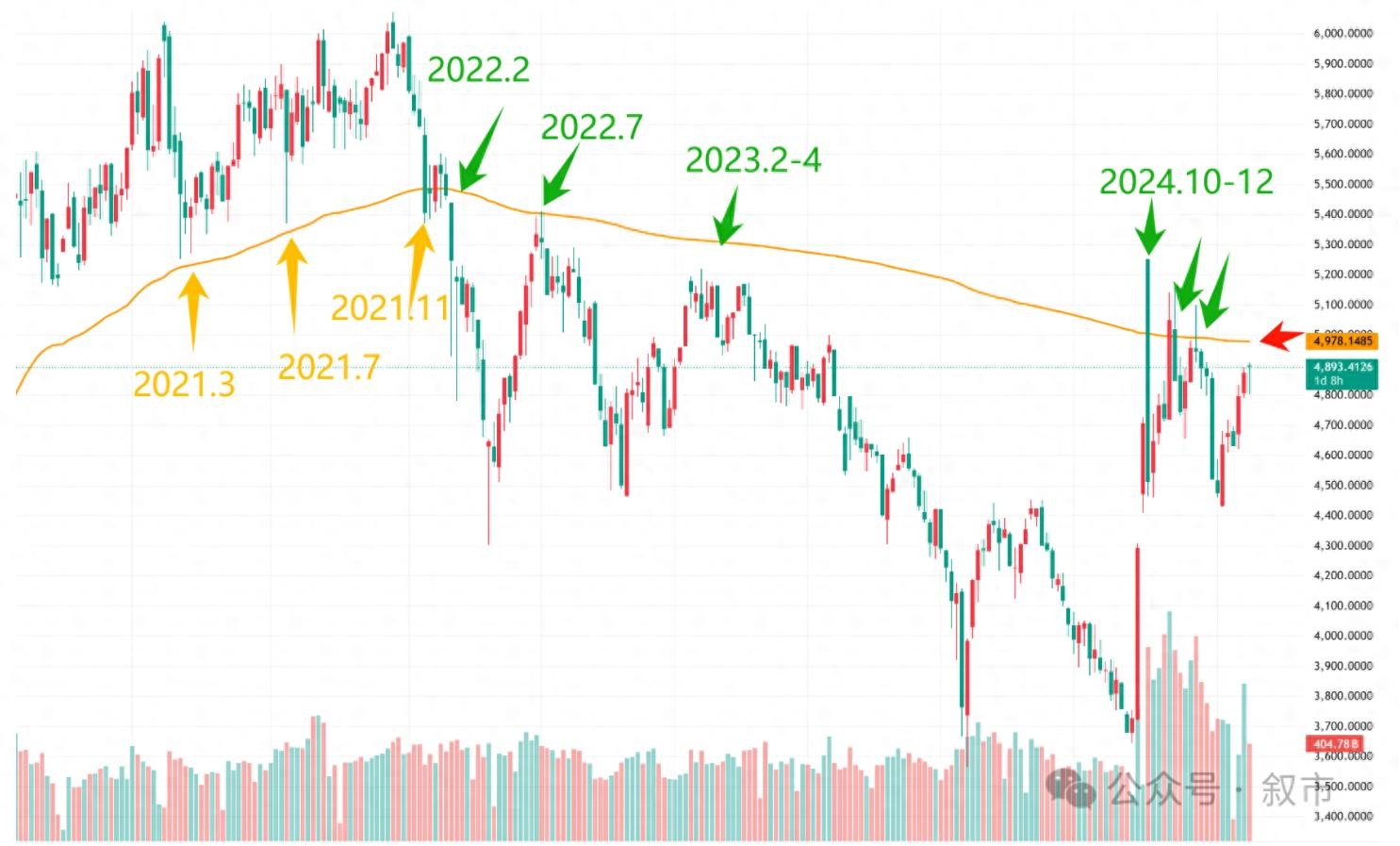 它一路上撑住了2021年3月、7月、2021年11月的三次大回调,最终在2022年2月跌破;随后转为超强压力位,2022年7月反弹行情在这戛然而止。之后的2023年2-4月,行情蓄力两个月也无法突破,随后房地产市场低迷,经济增速放缓,A股低迷。直到今年9月、10月市场才发起行情,但仍旧在该线附近受阻。随着昨天的反弹,中证全指又接近了,下半周突破时在这附近也是巨大考验,压力位4980点。