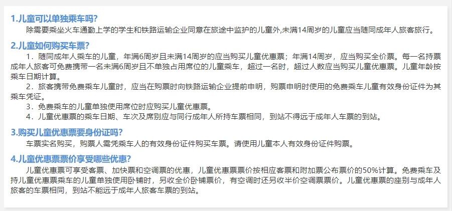 3、免费乘车的儿童单独使用席位时应购买儿童优惠票。