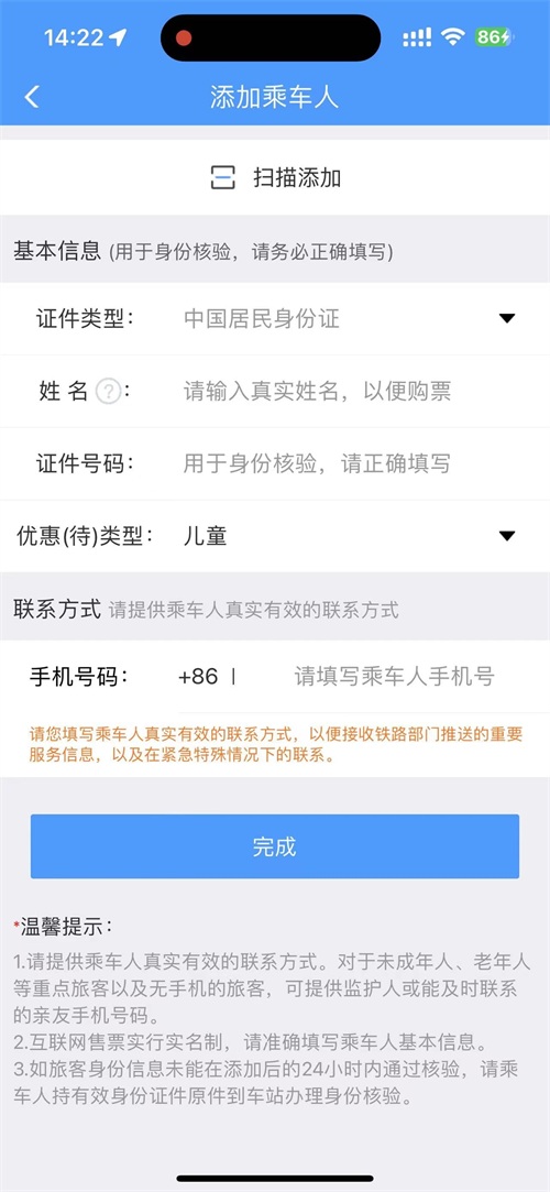 第三步:点击主页面右下角“我的”添加乘车人信息并保存。儿童手机号可以填写父母的。