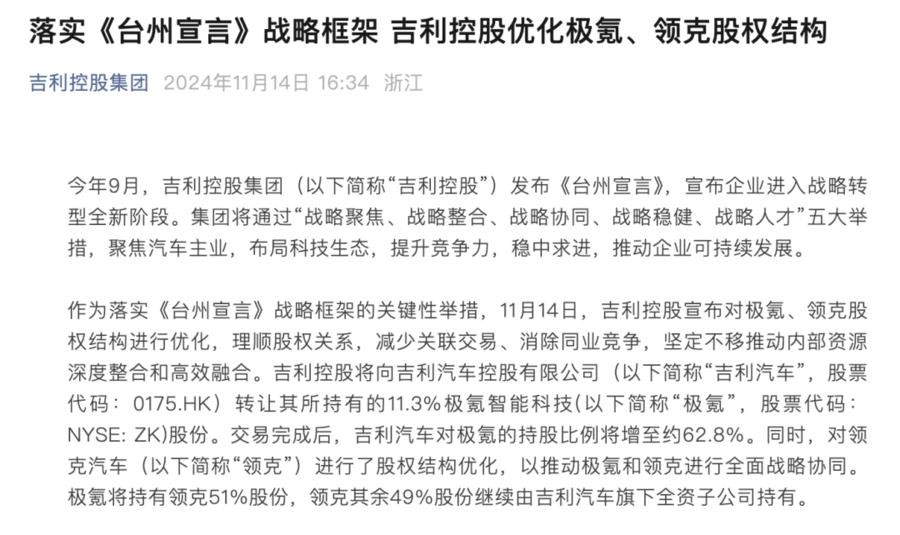2024年12月3日,极氪智能科技有限公司副总裁林金文在微博上宣布,极氪和领克两大品牌已进行战略整合。