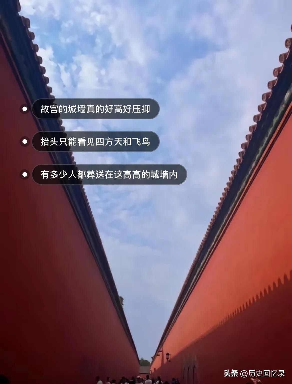 开放的叫故宫,不开放的才叫紫禁城,不少人觉得, 肯定有一部分要禁起来的,紫禁城里面有些地方有重要文物 怕别人破坏 开放后就做不到完美保存, 以前不懂觉得怎么会是“四四方方的天”呢后来才知道,原来宫墙真的好高好高,困住了一个又一个她, 人在里面显得渺小,如果在那个年代宫门关着,真在里面,根本没可能出去,透过门缝看向里面时,也许许多年前也有人透过缝隙看向外面,百年的对视,只不过时空交错了位置