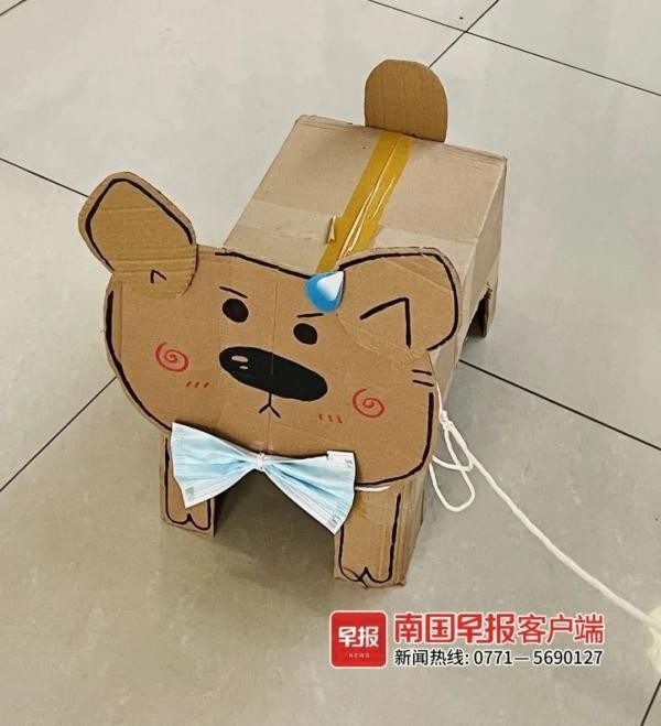 雨薇用快递盒制作纸壳狗,并配上了表情和蝴蝶结。