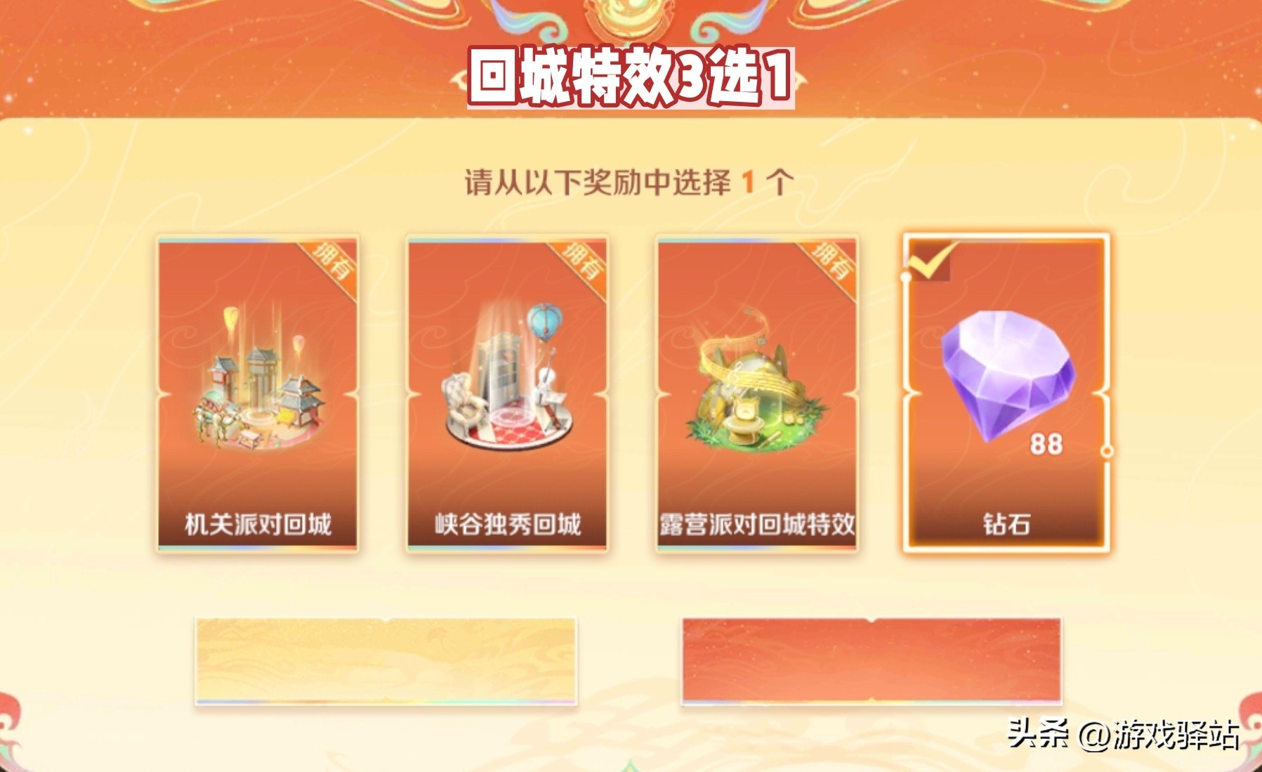 其次抽取之前,大家记得先将两个最大的自选奖励选定,其一是沈梦溪的龙舞盛年和20个皮肤碎片2选1;其二是露营派对/峡谷独秀/机关派对回城特效和88钻石4选1。沈梦溪这款皮肤主打年味喜庆风格,建议优先选择,当然不会玩沈梦溪的小伙伴,也可选择20个皮肤碎片,不过碎片商店兑换一款勇者皮肤需要48个皮肤碎片,因此相比之下还是选皮肤更划算。