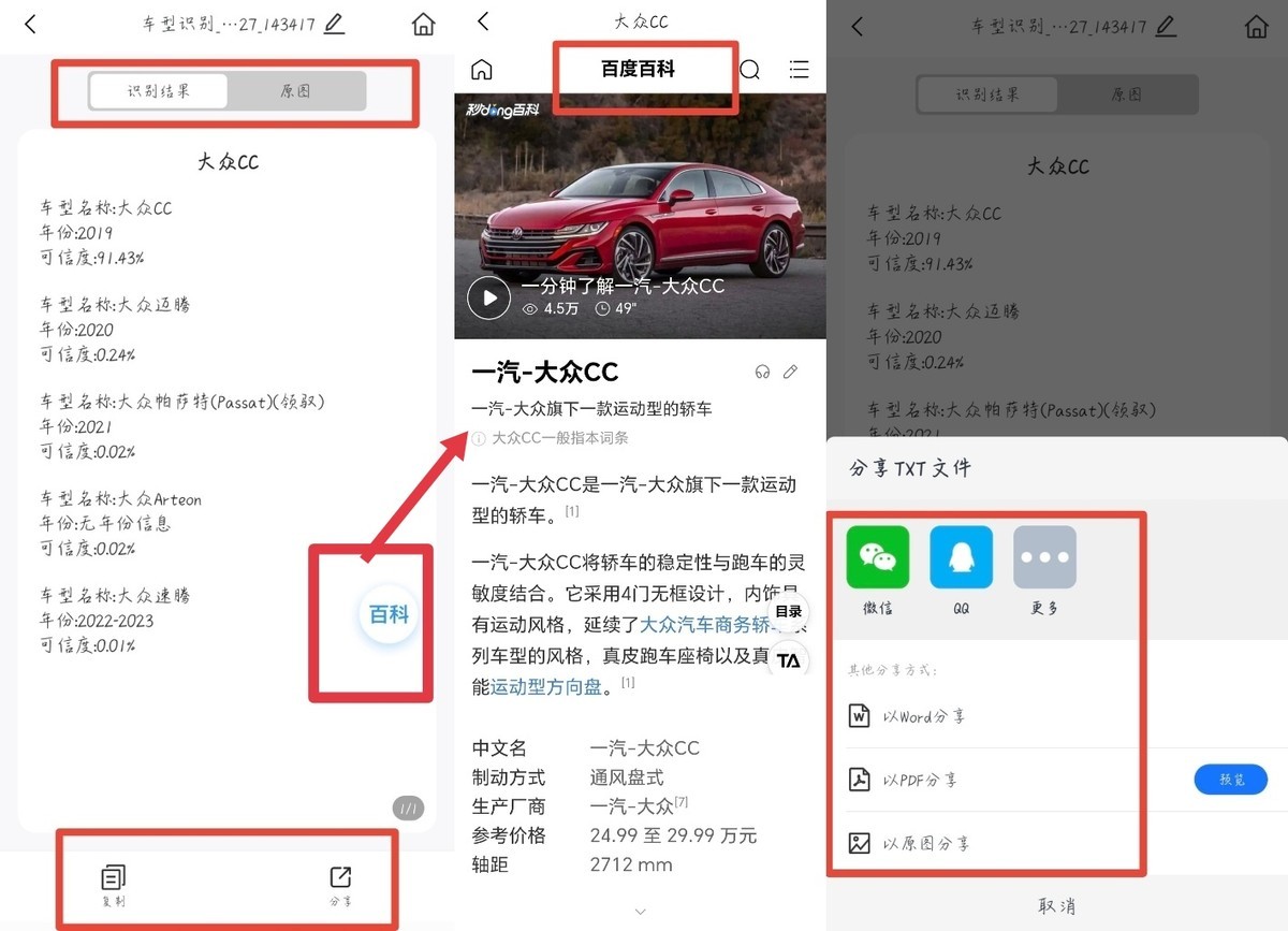 支持手动调整识别范围,可对图片进行旋转和滤镜更换,确定好后点击“识别”,可切换查看识别结果和原图,支持对识别结果复制和分享,还可点击跳转至百度百科查看更详细信息。