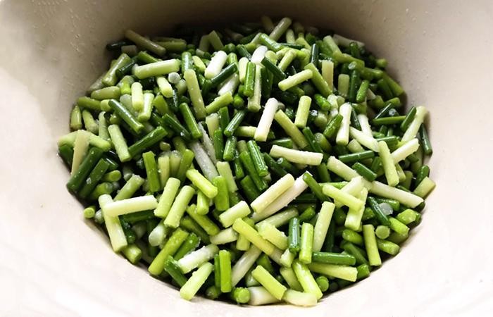 第二步,取出一个容器,放入切好的蒜苔,按照500克蒜苔放20克食盐的比例,撒入食盐,直接上手抓揉均匀。然后静置半个小时左右,目的是腌出蒜苔里面的水分,这样后面更容易入味,口感也更脆。