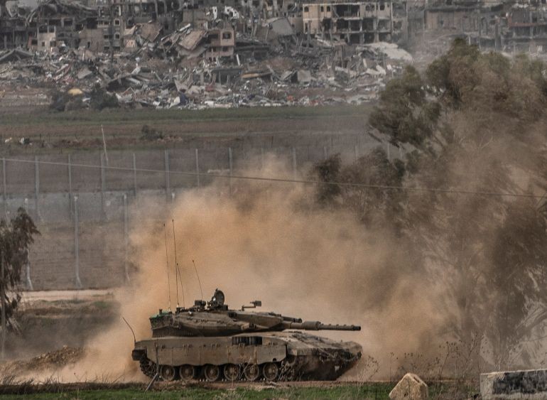 周六,以色列南部,一辆以色列军队的坦克在加沙地带边境附近行驶。