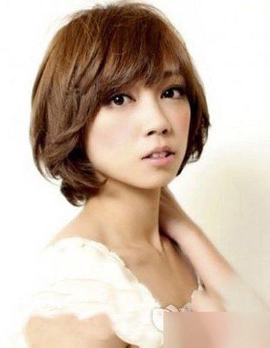 厚实的齐刘海部分,凸显出女生婉约文静气息,短的头发是修剪出层次,染出的头发颜色更加显潮流,百搭实用的流行发型示范,微卷的头发符合菱形脸的梳发。