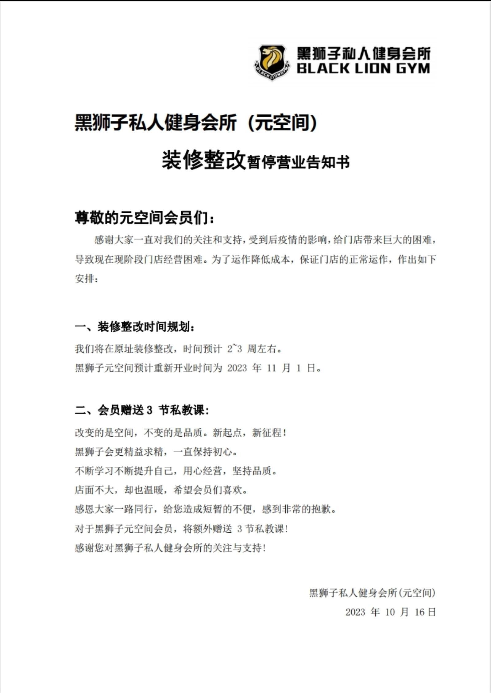 一张网传截图显示,黑狮子私人健身会所(元空间)曾于10月16日发布声明称,受到后疫情的影响,现阶段门店经营困难,为了降低成本,该门店将进行装修整改,预计于同年11月1日重新开业。但是,就11月6日的走访情况而言,该门店并未重新开业,且现场无张贴任何关于这方面的告示。