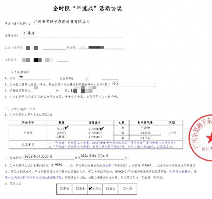 许雁家住广州,她告诉南都·湾财社记者,今年4月,她在店长的推荐下,花费39800元报名参加了黑狮子的“年挑战”活动,即是,若学员完成挑战,黑狮子便会返还75%的学费(即29850元),剩下25%则作为场地费,不予退还。合同上显示,签署合同的另一方为广州市黑狮子东圃健身有限公司,挑战期限为今年4月5日至明年4月4日。