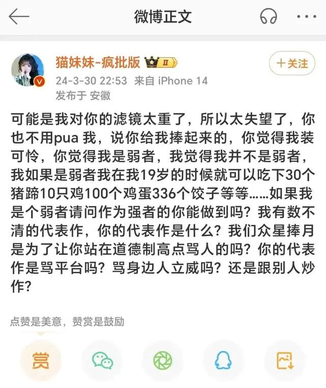 3 月 30 日,快手平台上拥有千万粉丝的网红 " 猫妹妹 " 在微博上公开指责其师傅辛巴,控诉其对自己实施了心理操控(PUA),言辞中流露出深深的失望。