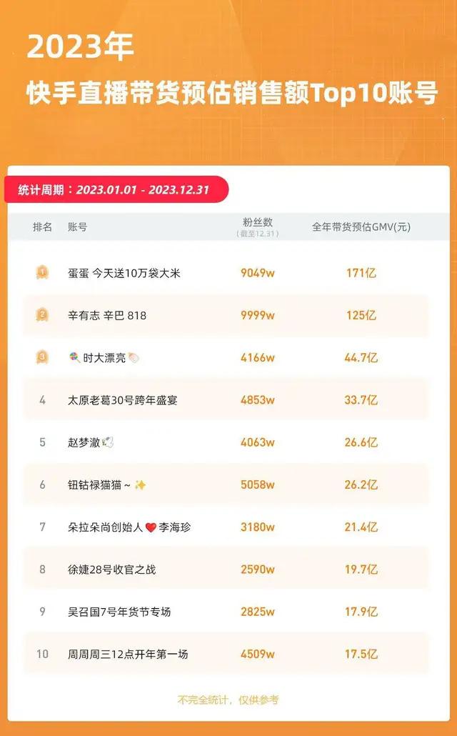 数据显示,2023 年快手直播带货预估销售额 Top10 账号榜单中,蛋蛋、辛巴和时大漂亮位列前三。