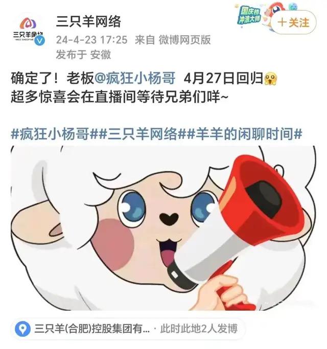 日前,三只羊网络透露,小杨哥将于 4 月 27 日重返直播间,这次回归距离他上次直播已有长达一个月的间隔。