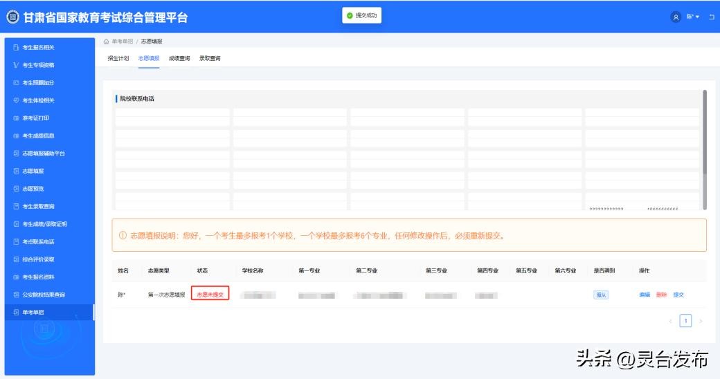 点击确认后,如下图所示,新增志愿点击确认后,只是保存了志愿。一定要进行下一步操作------提交志愿。