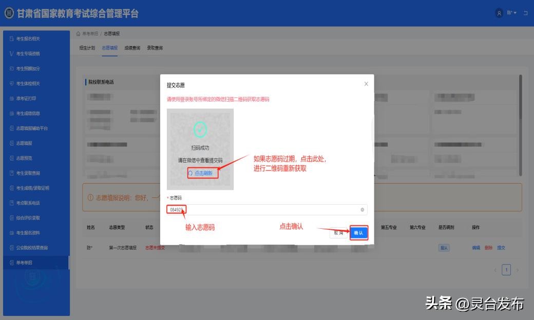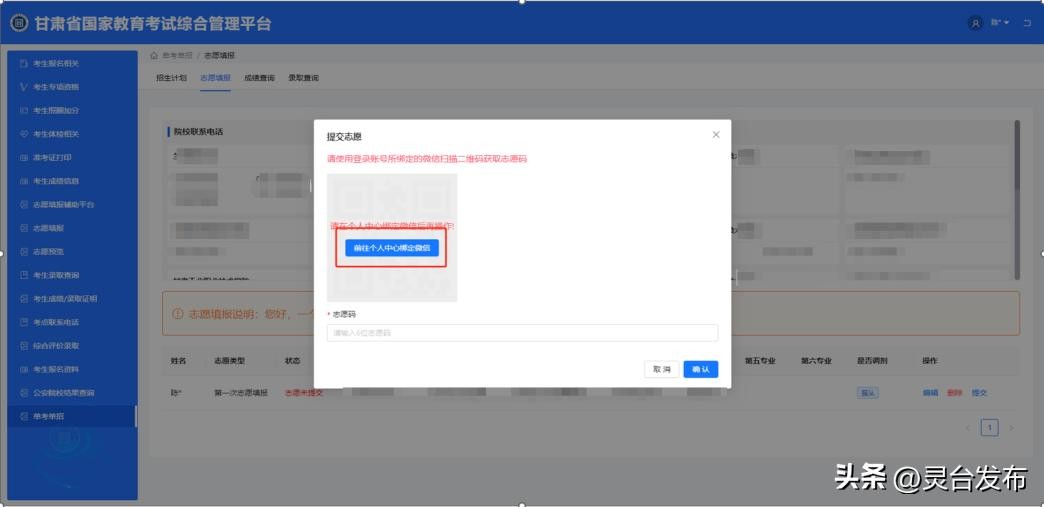 考生点击提交按钮,提交给高校。点击提交之后,需要输入志愿码,而志愿码是需要通过账号绑定的微信扫码获取的。如果没有绑定微信,会出现如图所示界面,考生按相关提示进行微信绑定。