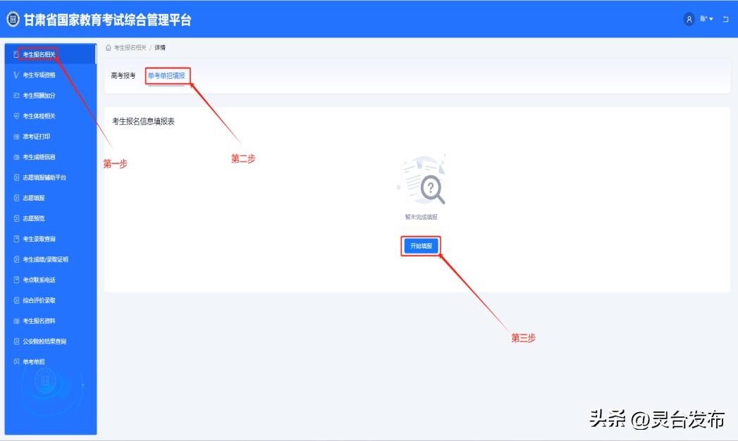 先点击考生报名相关菜单,然后点击单考单招填报菜单按钮,再点击开始填报,进行报名。(步骤如图)