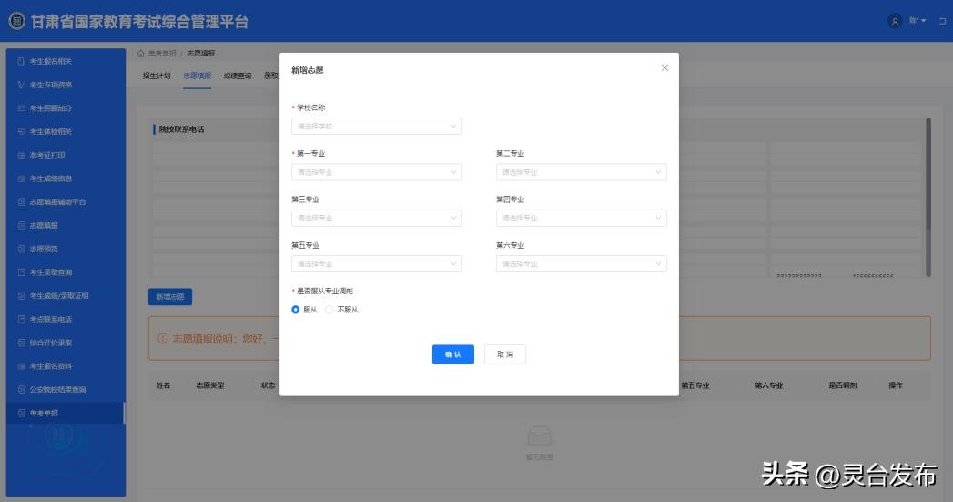 选择学校→选择专业→选择是否服从调剂(是否服从调剂默认为否)→点击确定