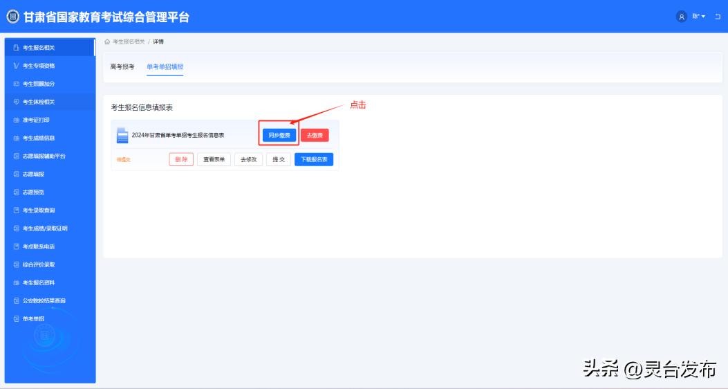 (2) 缴费页面长时间未跳转,可以点击考生报名相关,进入单考单招填报,点击同步缴费。