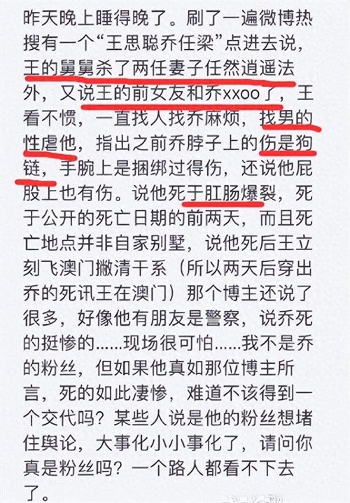 很快王思聪就被推上了风口浪尖,因为有网友发现乔任梁去世的时候脖子上有裂痕,而且“肠子外露”。
