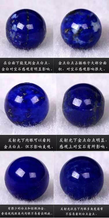 青金石在选择上以色泽均匀无裂纹,质地细腻无金星为佳,无白洒金次之,洒金指金星均匀分布如果黄铁矿含量较低,在表面不出现金星也不影响质量。但是如果金星色泽发黑、发暗,或者方解石含量过多在表面形成大面积的白斑,则价值大大降低。其次是大小,越大的青金石成品越是珍贵,大而几乎无瑕的成品价格极高。