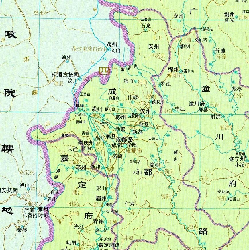 这段历史时期成都又有怎样的特点呢?元朝时期,成都辖区隶属于四川行省的成都路、嘉定府路分别管辖。成都在元朝时期的地图上又是怎样的呢?