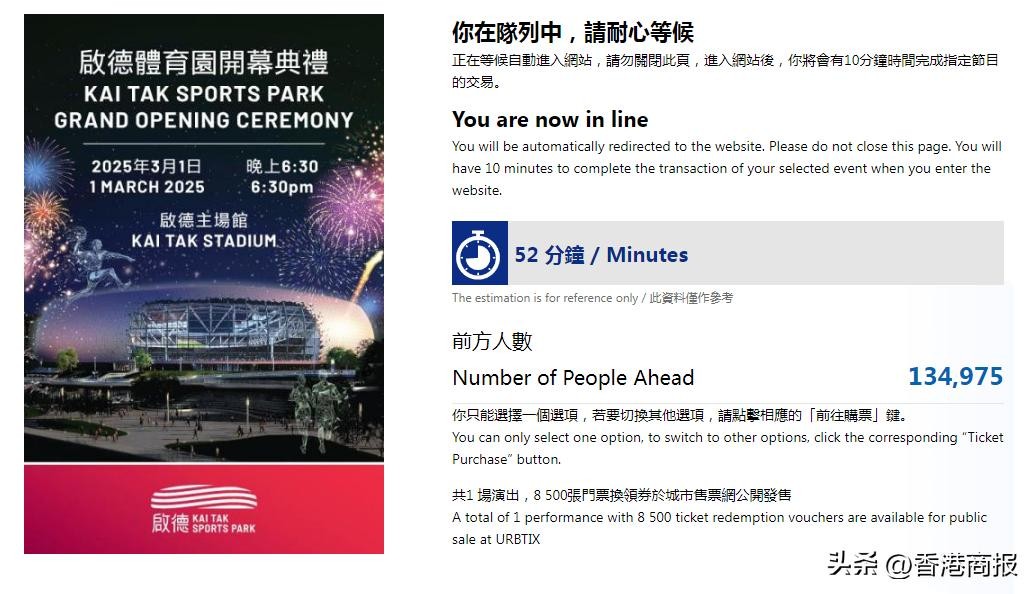 港商君也在10时许进入售票网页,显示有十多万人排队购票,等候时间近1小时,最终8500张门票半小时左右已全部售罄。