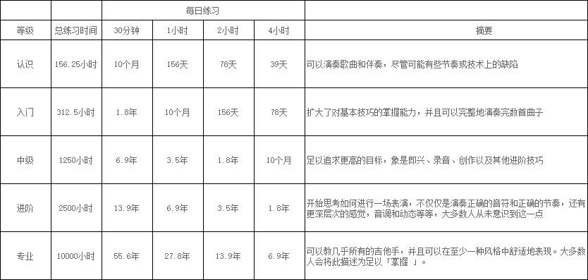 你每天有两个小时以上的时间可以练吉他,那么预计花两年的时间,你可以获得【中级】的程度。
