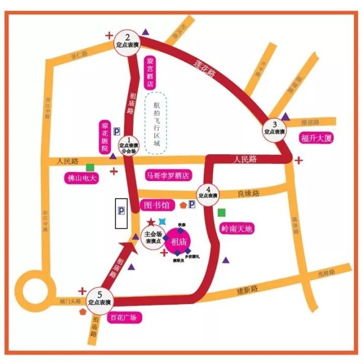 从祖庙牌坊广场出发北行,进入祖庙路——琼花大剧院路口(定点表演1)——旋宫路口(定点表演2)——莲花路——福贤路(福升大厦前路口:定点表演3)——人民路——天地路(天地路与良缘路交叉路口:定点表演4)——百花广场十字路口(定点表演5)——祖庙路——祖庙结束,全程约3.5公里。