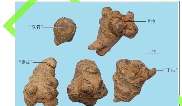 剪口呈不规则的皱缩块状或条状,表面有数个明显的茎痕及环纹,断面中心灰绿色或白色,边缘深绿色或灰色。