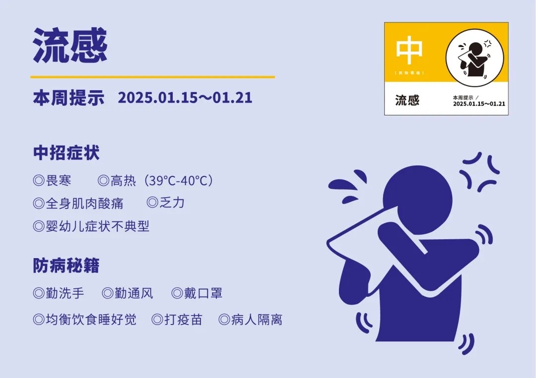 1月15日-21日,深圳市流感风险等级为“中”,已连续两周为“中”。