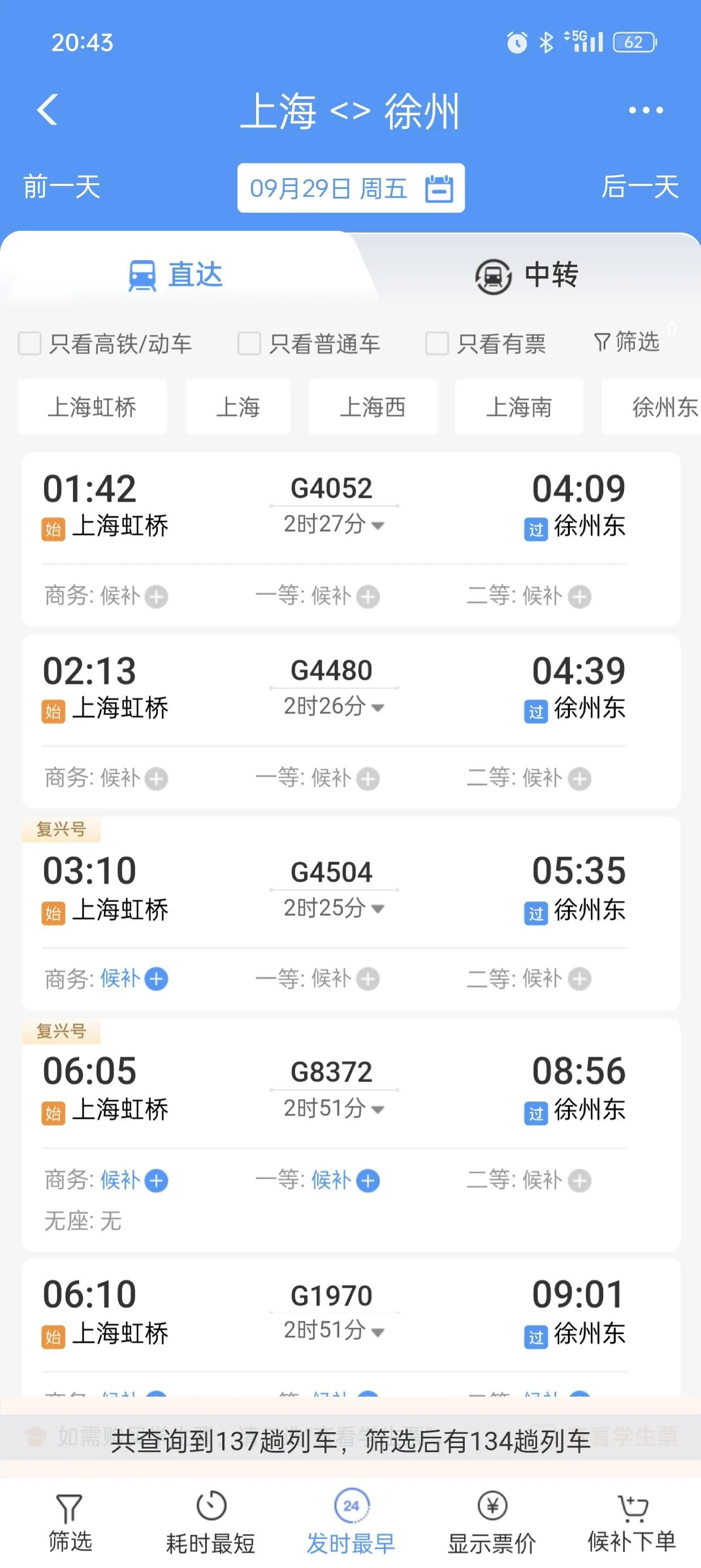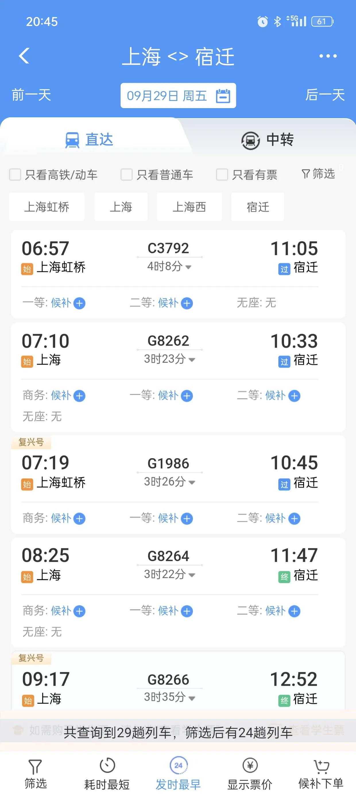 首先看一下上海到杭州的,作为一个参照,29号当天共有208趟火车高铁。