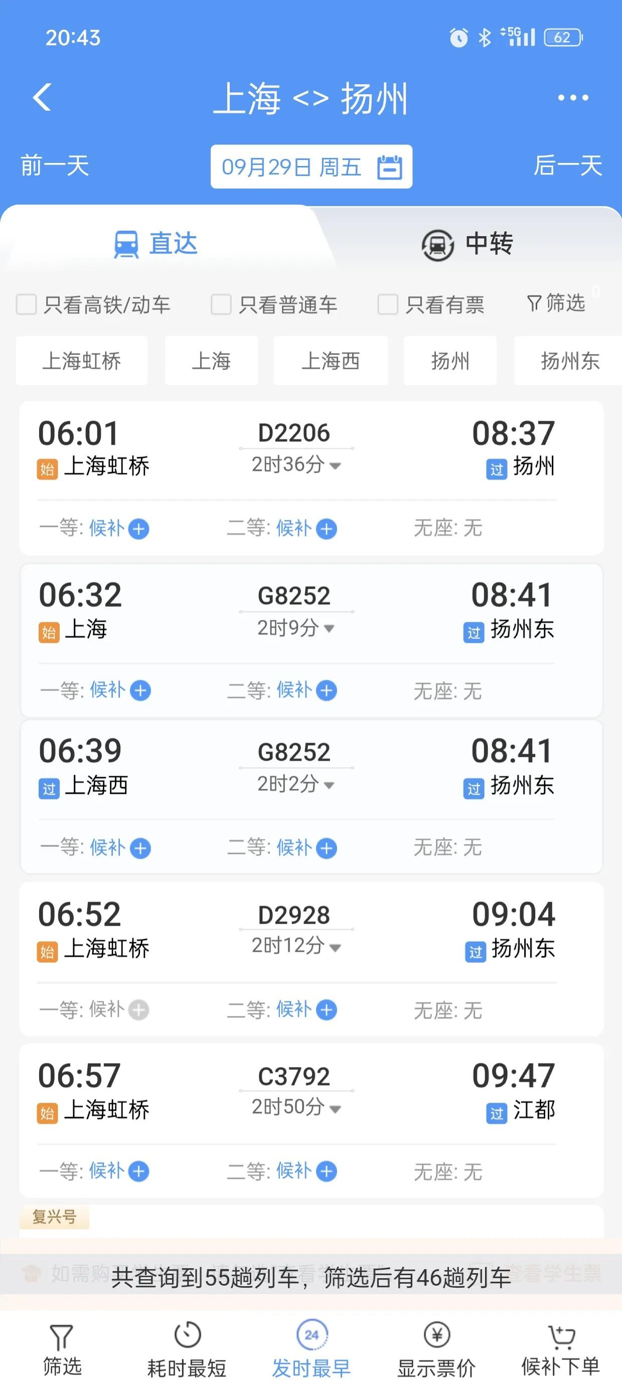 上海到扬州有46趟,全都是高铁,没有普通的火车。
