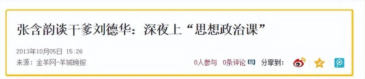 刘德华是张含韵的干爹,也是她的恩人。2006年,张含韵来到香港发展,在一次颁奖典礼上,她遇到了刘德华。刘德华对张含韵非常照顾,并且在活动结束后,让自己的助手叫张含韵去酒店谈谈。张含韵当时很紧张,不知道刘德华要和自己说什么。但是李小磷告诉她不用担心,刘德华是个好人。