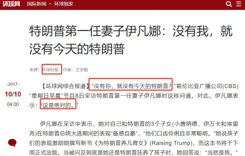 【1】环球时报:《特朗普第一任妻子伊凡娜:没有我,就没有今天的特朗普》