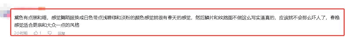 还有网友给杨丽萍建议,“黛色有点黑和暗,感觉舞蹈服换成白色带点浅碧绿和淡粉的颜色感觉就很有春天的感觉,然后鳞片和纹路图不做这么写实逼真的,应该就不会那么吓人了,春晚感觉适合更亲和大众一点的风格。”