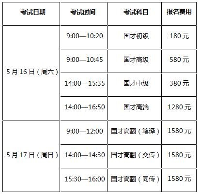 2020年上半年国才考试将于5月16—17日在全国举行,开考科目包括国才初级、国才中级、国才高级、国才高端、国才高翻(笔译)、国才高翻(交传)、国才高翻(同传)。考生可于1月14日至4月20日期间登录国才官网(etic.claonline.cn)在线注册报名。