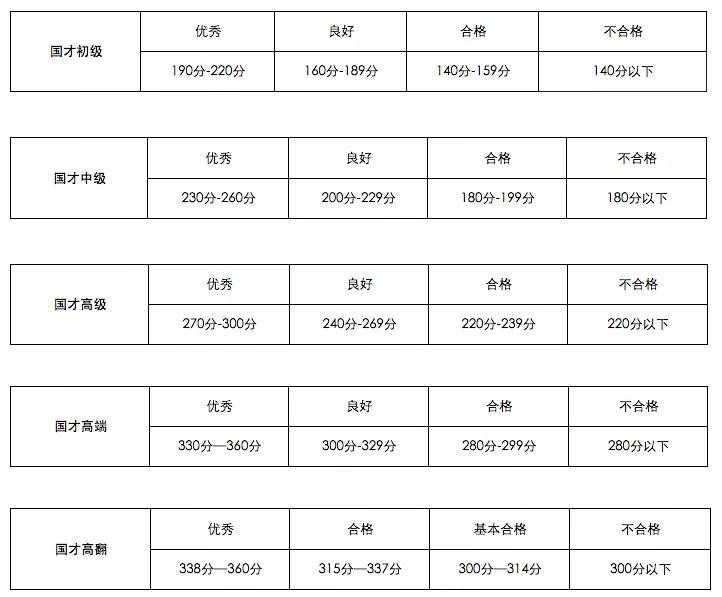 国才考试每个科目的成绩与等级如何对应?