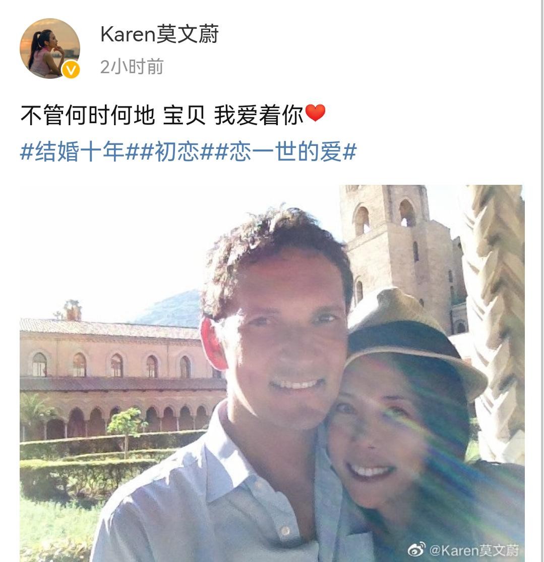 10月2日,莫文蔚在社交平台上晒出和外籍老公Johannes的多张甜蜜合照,并配文告白对方称自己会永远爱他,以此来庆祝结婚10周年。