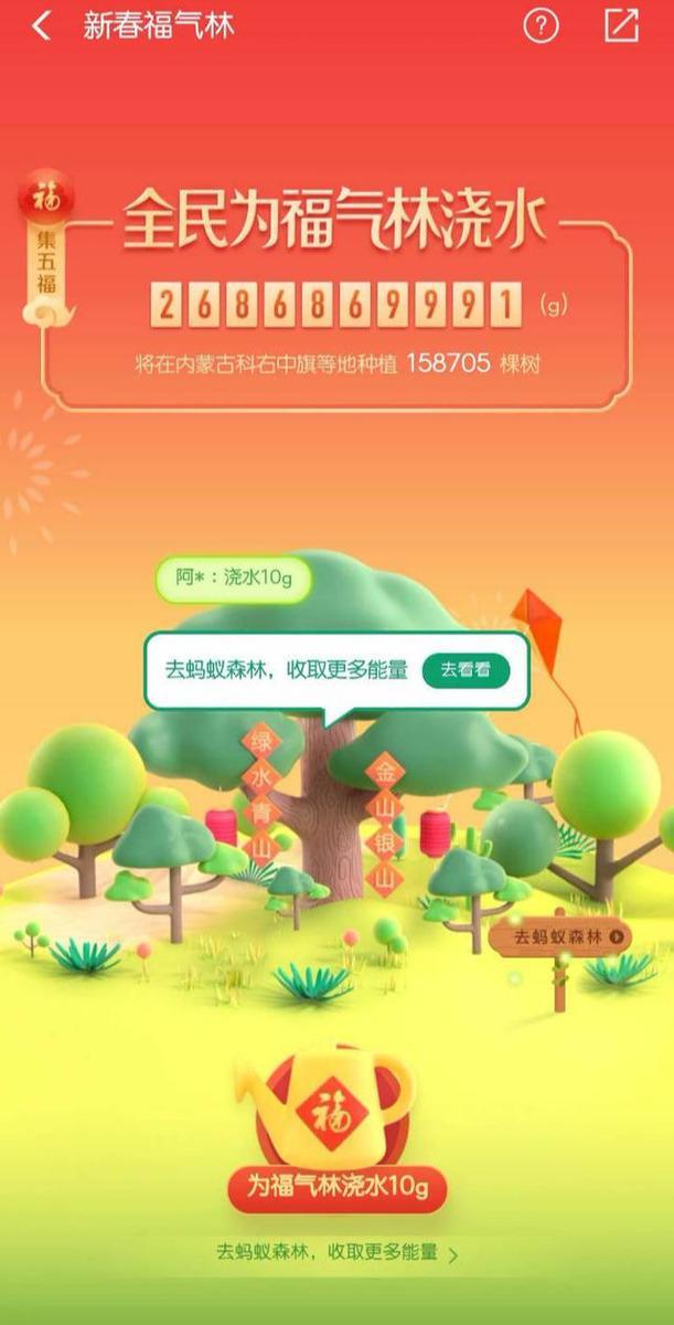 3.蚂蚁森林福气林浇水得福卡,一直浇水,直到次数用完 !