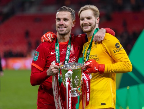 2月27日,利物浦队队长亨德森(左)和守门员凯莱赫在比赛后庆祝胜利。 新华社发