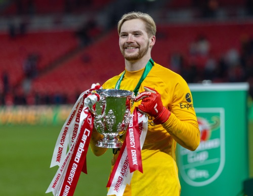 2月27日,利物浦队守门员凯莱赫举起奖杯庆祝胜利。 新华社发