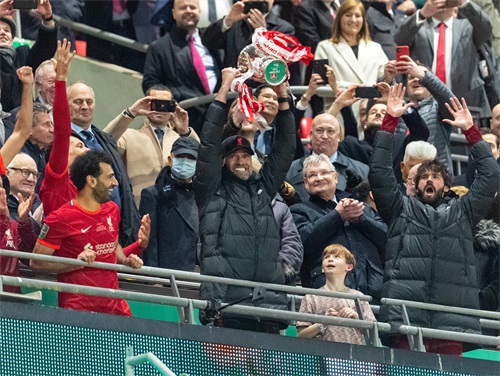 2月27日,利物浦队主教练克洛普(中)高举奖杯庆祝胜利。 新华社发