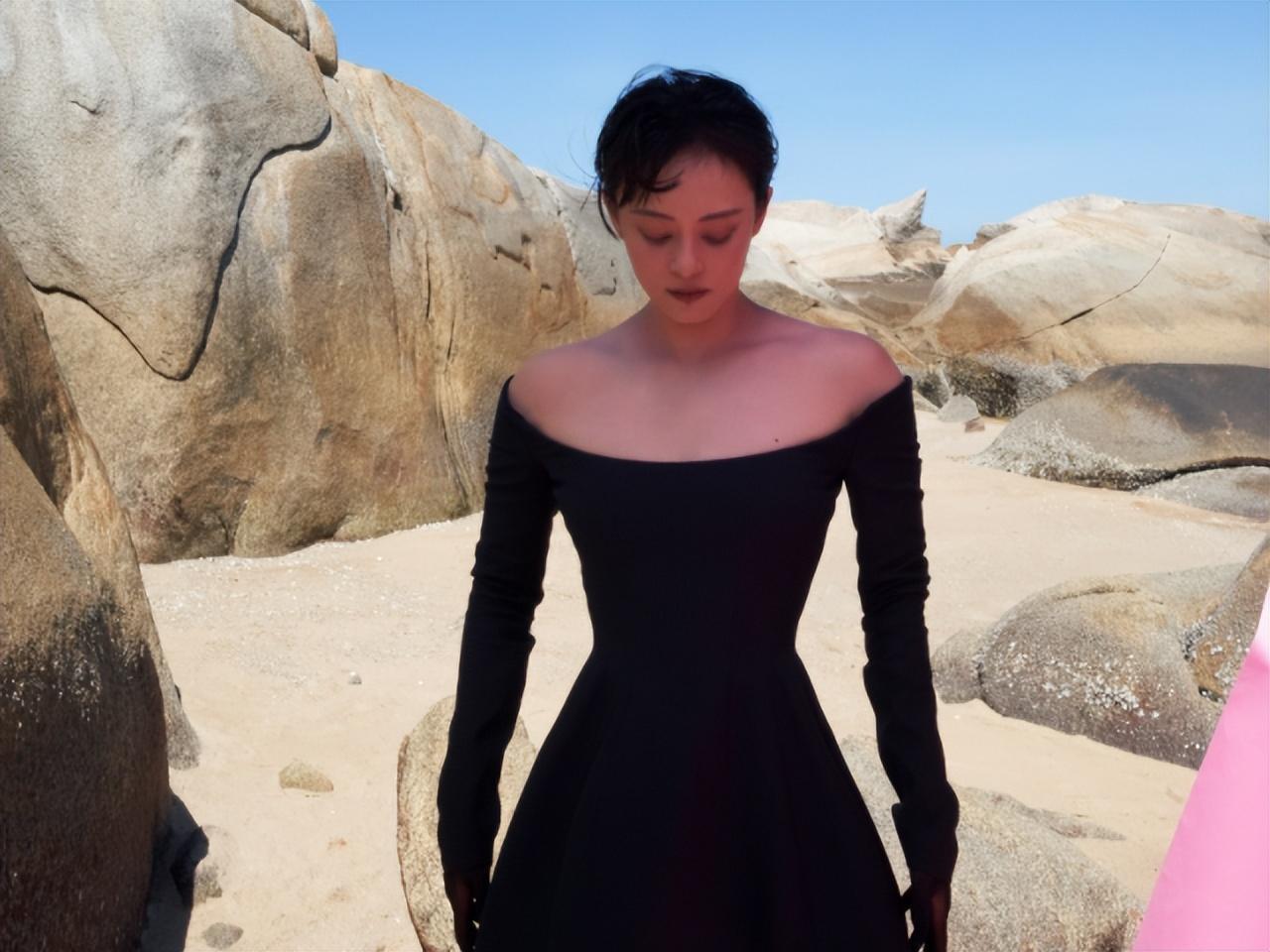 照片中,孙俪一身黑色露肩长裙,站在海边的礁石旁,露出那胸前白嫩的肌肤,脸上还化着精致的妆容,尤其是那烈焰红唇看上去非常的诱人,额头上的几缕碎发更是将她衬托的非常妩媚。