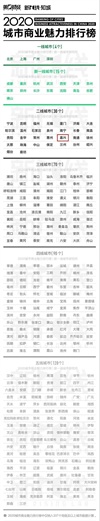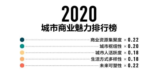 《2020城市商业魅力排行榜》按照商业资源集聚度、城市枢纽性、城市人活跃度、生活方式多样性、未来可塑性五个方面作为一级维度来评估城市。