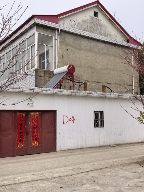 大皖新闻记者随后来到该村中心组居民点,发现有几户房屋的墙上喷涂有标记,其中一户楼房墙壁上喷涂着“D04”标记,“这个是上面来人喷上的,是俺二弟家的房子,人出去不在家,他家房子已经量过了。”一位自称姓倪的村妇告诉大皖新闻记者说。