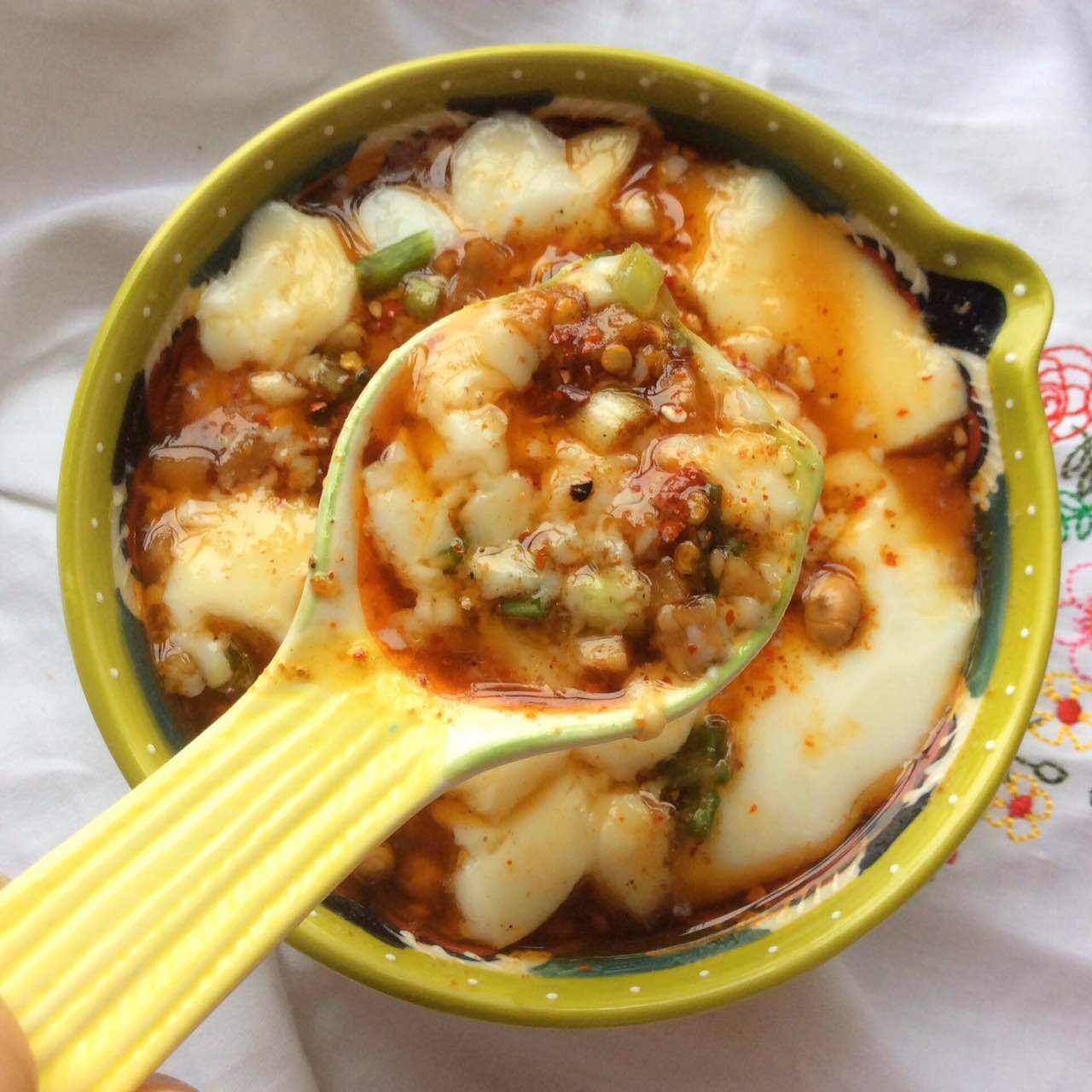 8,把豆花舀出来,加点儿调料就可以吃了哦。。喜欢甜的就放糖,喜欢咸的就放盐,酱油这些吧我的这个做的是咸的,加了酱油,葱花,盐,醋,大头菜,辣椒油,很好吃,很嫩气的呢