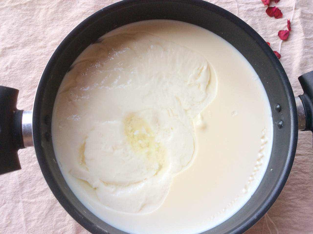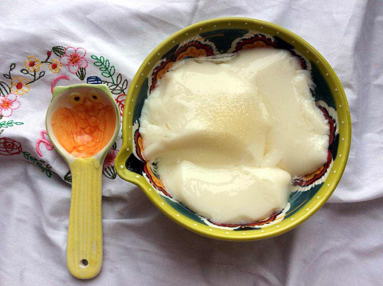 7,融化的内酯倒入豆浆里面,用勺子轻轻搅拌均匀。再盖上锅盖,静置10到15分钟样子,豆花就凝固好了哦这是我第一次做的,用的300克的豆子做的,好大一锅,后面送给小区的朋友了