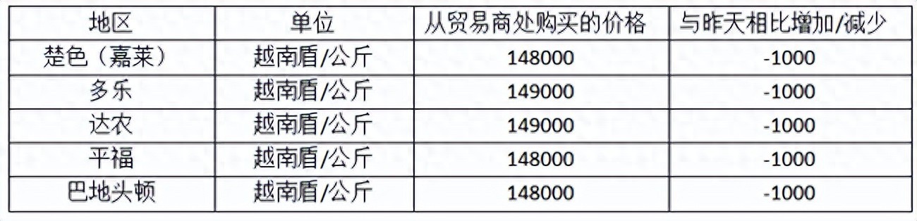 在中部地区,多乐胡椒的价格为149000越南盾/公斤,较昨天下跌1000越南盾/公斤;楚色嘉莱胡椒的价格为148000越南盾/公斤,较昨天下跌1000越南盾/公斤;达农胡椒的价格为149000越南盾/公斤,较昨天下跌1000越南盾/公斤。