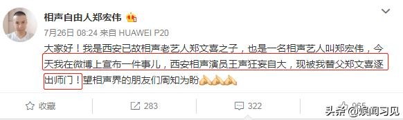 王声的师父是老辈艺人郑文喜,他的儿子是西安的相声艺人郑宏伟,他在26突然在微博宣布替父亲把王声逐出师门,逐出师门的理由是“王声狂妄自大”。这个消息对很多网友来说还是很震惊的,纷纷留言询问具体的原因,不过郑宏伟给出的原因确实让人诧异